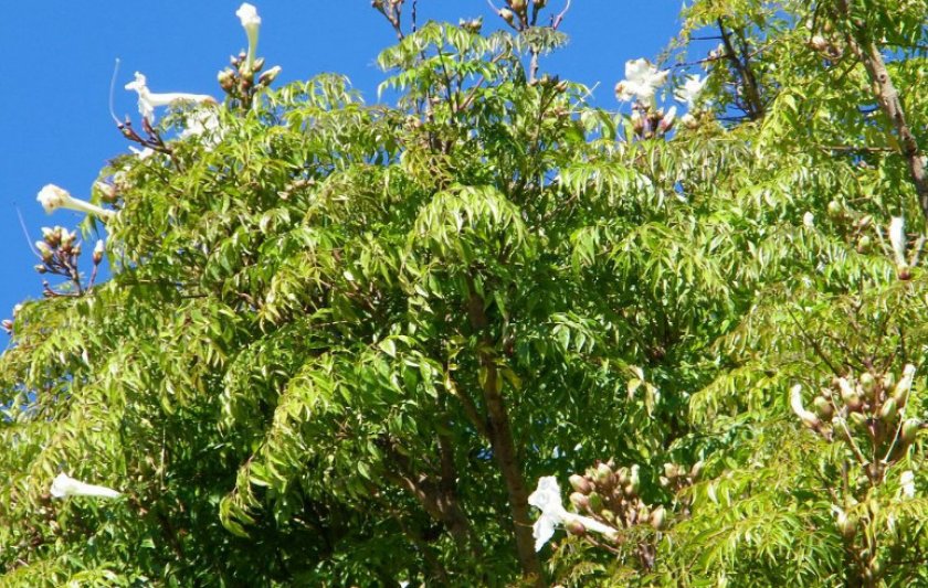 Radermachera xelocarpa. Радермахера древесноплодная. Растёт в Индии. Одноствольное деревце высотой 5-10 метров. С весьма интересной кроной во время цветения. На потрескавшейся старой коре, между ярко-изумрудными листьями, имеющими длину около 100 сантиметров, распускаются маленькие соцветия, состоящие из воронковидных бутонов. Кромки цветов отогнуты и имеют обширное волнообразное окаймление. Лепестки белоснежного окраса, а зев кремово-желтый.- При всей видовой разнообразности, в качестве домашнего комнатного цветка выращивается только лишь единственный вид — радермахера китайская (Radermachera chinensis). Её отличают— большие глянцевые изумрудного цвета листья, 70 сантиметров в длину и 25 сантиметров в ширину. Лист разделен на несколько малюсеньких листиков длиной до 4 сантиметров.