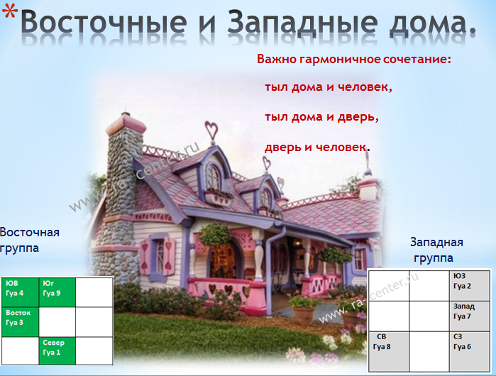 Определяем посадку дома согласно благоприятной восточной ( В, ЮВ, Ю,С) или западной группе (СЗ,З, ЮЗ, СВ) для человека. Тем самым мы уже имеем связь триграммы дома с Гуа человека.