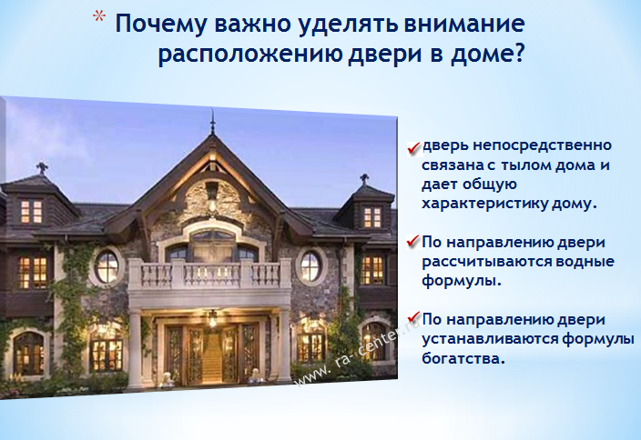 Дверь в дом в фэншуй один из основных аспектов при строительстве дома и выборе квартиры. Расположение двери на фасаде дома относительно тыла дома и непосредственно направление двери необходимо учитывать на самых первых стадиях проектировки дома. Обязательно просчитываем, где мы сможем поместить вход, дверь в дом с учетом фэншуй.