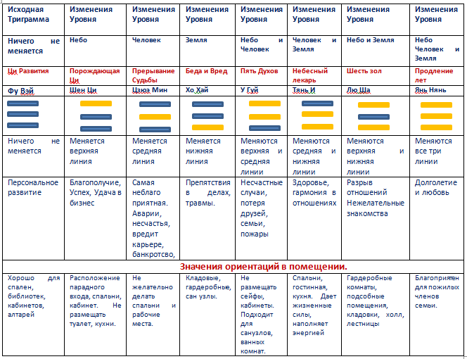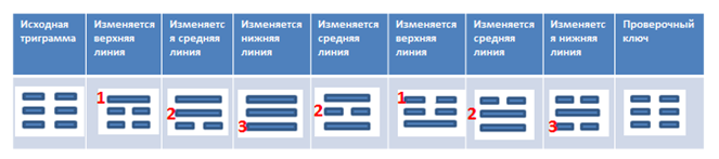 Исходная триграмма в таблице может быть любая. Нам важно проследить последовательность изменения линий и запомнить формулу.