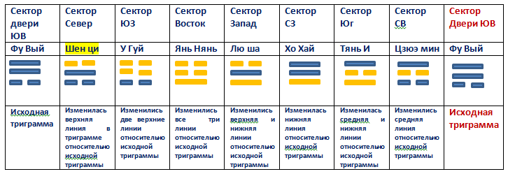 Каждая триграмма соответствует определённому сектору. Подписываем характеристики триграмм в соответствии с изменившимися линиями относительно исходной триграммы и отвечающей домашнему местоположению, сектору . Теперь мы можем дать энергетическую характеристику.