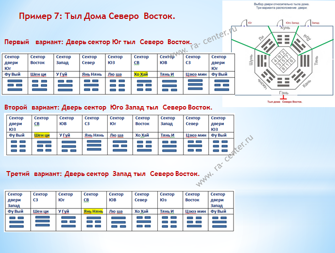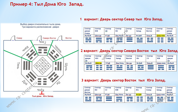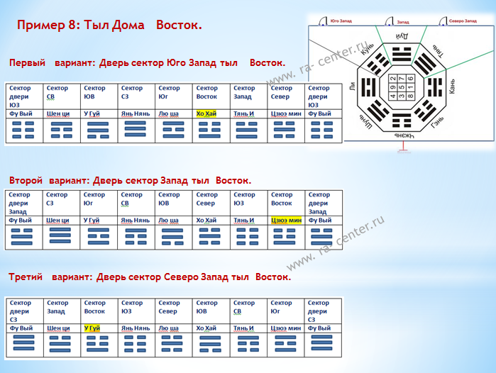 На рисунках четко видно , что тылу двери ( в 1 примере) соответствует Восточное направление, а значит и триграмма Чжэнь , а в примере 2 тылу двери соответствует Южное направление, следовательно и триграмма Ли.