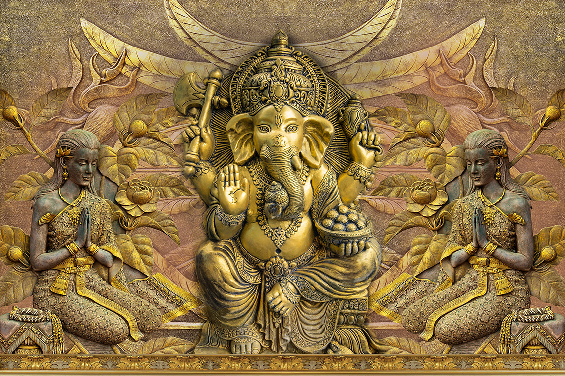 Ганеша — Ведическое божество с большим животом и головой слона, держащий в руке блюдо со сладостями, приносящий удачу.