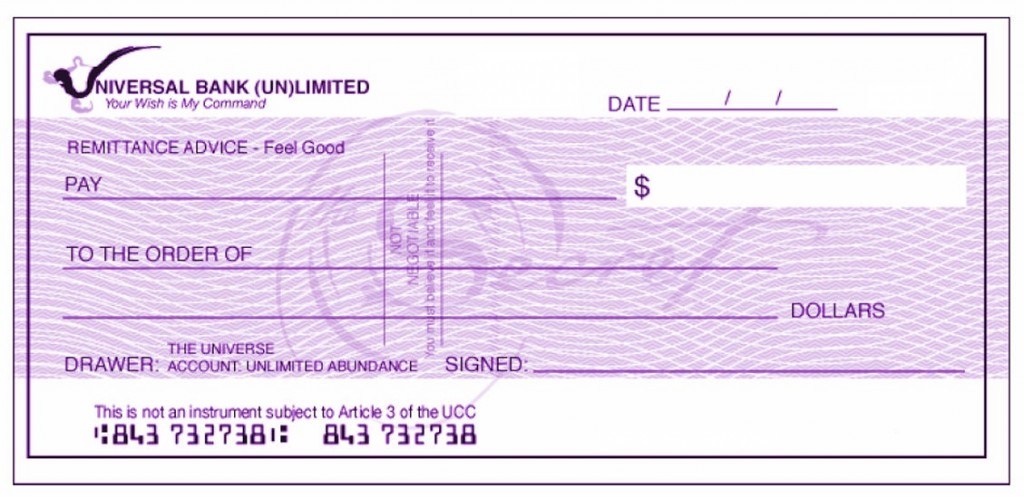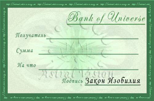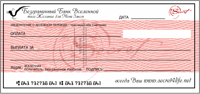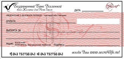 Вы легко можете стать “клиентом” Банка Великих Возможностей и получить кругленькую сумму на осуществление своей заветной, но вполне материальной мечты! Условия очень простые: позитивный настрой и четко сформулированная мечта. Вам нужно правильно заполнить личный Чек Изобилия и ждать поступлений на свой виртуальный банковский счет.