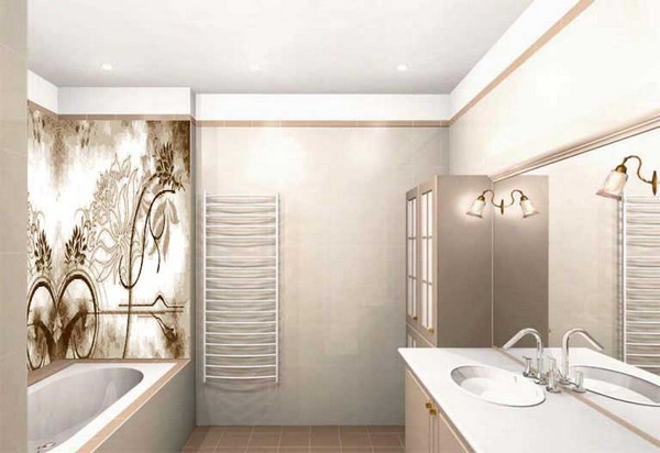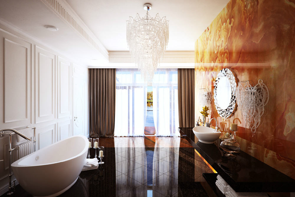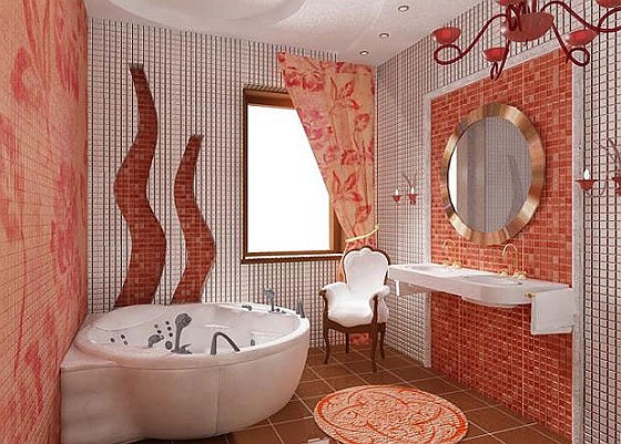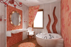 При отделке помещения следует отдать предпочтение кафелю, мрамору, стеклу, хромированной сантехнике.