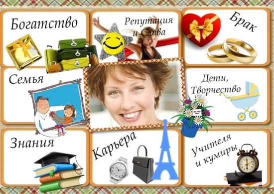 Во-первых, карту желаний следует делать сбалансированной в отношении разных сфер жизни. Карты желаний — это визуальное оформление вашего представления о вашем желаемом будущем, поэтому важно указать на ней не только богатство или новую квартиру, не только карьерный рост, или, скажем, замужество, но и другие сферы жизни: домашний уют, творческие успехи, здоровье, и т.д.