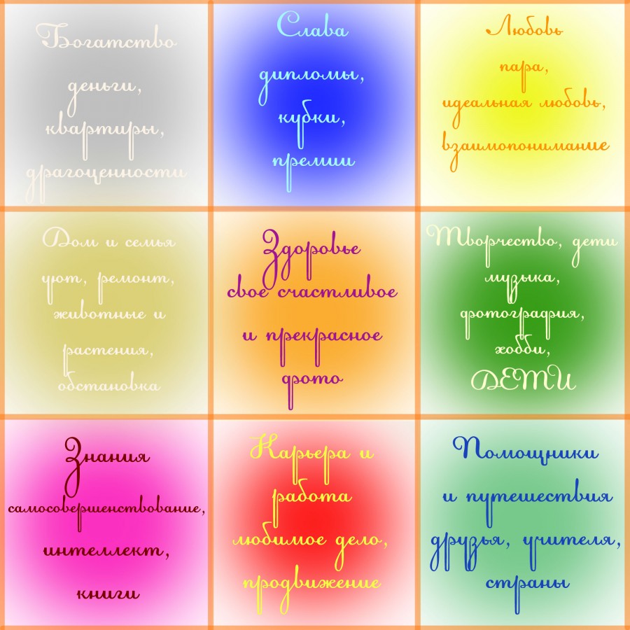 Для каждого «внутреннего» квадрата в Карте желаний предназначается конкретный оттенок. Порядок цветов нельзя нарушать, потому что это может оказать негативное влияние на эффективность работы энергетического инструмента по реализации намеченных целей. Цвета секторов следующие:
