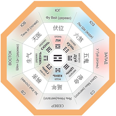 Некоторые сектора (Богатство, Любовь, Мудрость, Путешествия) занимают место между основными сторонами света.