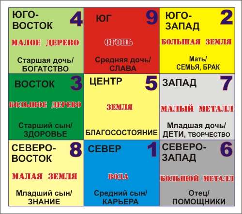 Некоторые специалисты фэншуй уверены, что располагать квадрат нужно таким образом, чтобы его северная сторона (сектор с первой цифрой) соотнеслась со входом в дом.