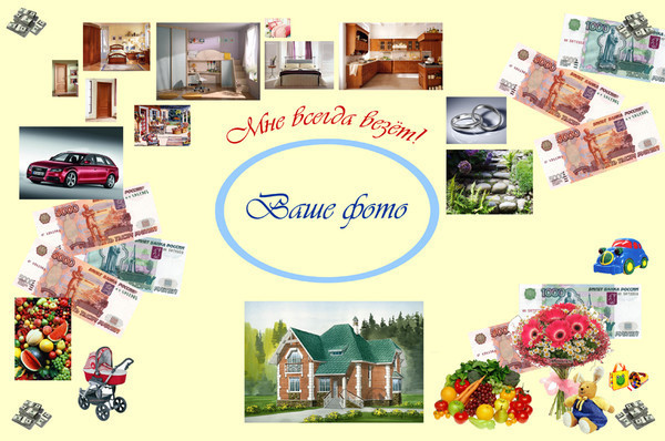 Вооружайтесь ножницами, самыми красивыми журналами и выберите свои фотографии, на которых Вы нравитесь себе больше всего. Что дальше, думаю, Вы уже догадываетесь. Выберите тот интерьер, ту машину, те драгоценности, ту красотку или красавца, то загородный дом, что, по Вашему мнению, является олицетворением Вашей мечты. Наклейте все это на лист ватмана и поместите свою фотографию в центре всей этой красоты.