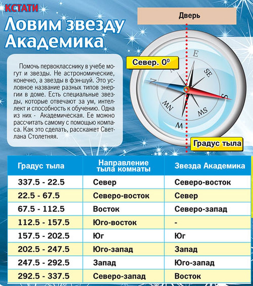 Так вот, чтобы Академическая звезда заработала, нужно просто поставить стол в место ее влияния. При этом нужно учесть самую неблагоприятную годовую звезду Пять Желтая, которая располагается в 2014 году на северо- западе , а в 2015-м перелетит на запад. Если
