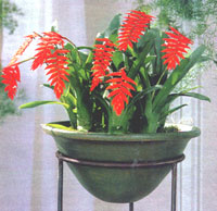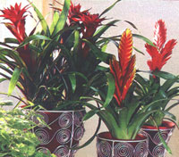 То же самое относится и к другому эпифитному растению – Вриезии . Эффектные колосовидные соцветия украшают растение в течение всего года. Нуждается в теплом (20°), влажном воздухе; полив производят в листовые воронки, почву застилают мхом сфагнумом. После цветения вриезия погибает, но оставляет отпрыски, которые укореняют в песочно-земляной смеси с добавлением сфагнума, торфа и древесного угля.