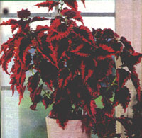 Огненное разноцветье вам обеспечат не только растения с красными цветками, но и с яркой окраской листьев. Роскошное цветовое пятно в помещении можно создать, используя современные гибридные сорта Колеуса Блюма. Колеус нуждается в хорошем освещении, частом проветривании помещения и регулярных, но не обильных, поливах. Поливать желательно кипяченной водой. Размножают колеусы черенками, которые легко укореняются во влажном субстрате. Чем ярче будет освещение (летом колеусу лучше всего находиться на свежем воздухе), тем роскошнее будет поразительная бархатистая окраска его листьев. В интерьере колеусы можно использовать в групповых посадках (высаживая в горшок по нескольку черенков; тогда кустики получаются особенно пышными.