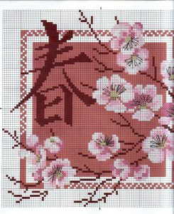 Эта цветущая вишня является символом любви и верности, поэтому ее цветение – это своего рода талисман на удачу и взаимопонимания в отношениях между влюбленными. Согласно последователям фен-шуя, чтобы привлечь новую любовь или укрепить существующий союз между двумя людьми, обязательно нужно расположить этот знак в своей комнате. Спальня – это идеальное место, куда можно повесить данный символ. Так как именно здесь должна быть нежная и тихая атмосфера. Ветка сакуры еще является символом обновления, молодости и радости. Вот почему обязательно необходимо вышить эту картинку своими руками в технике креста.